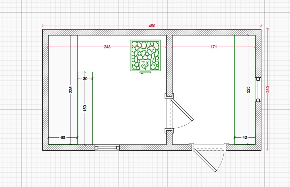 Размер бани 2.23х2.43 м.размер предбанника 2.23х1.67 м.