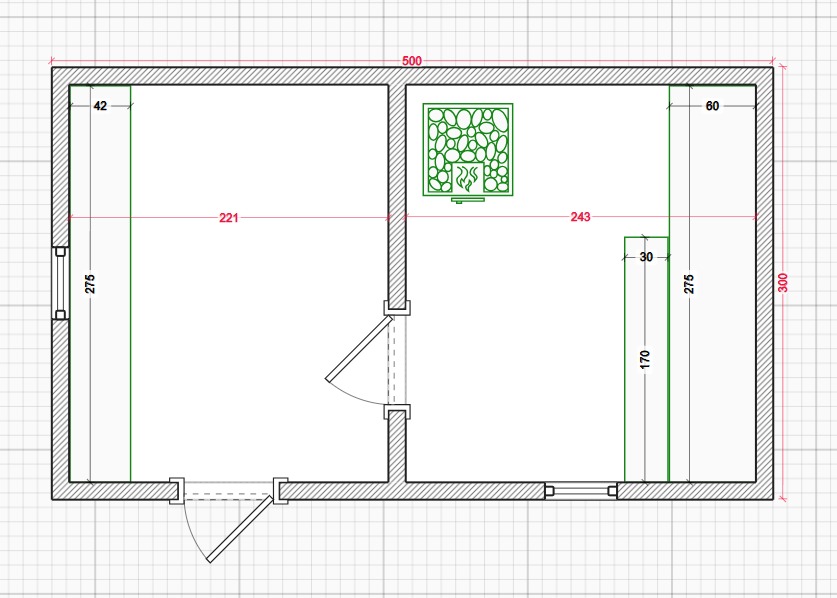 Размер бани 2.24х2.43 м. размер предбанника 2.24х1.17м.