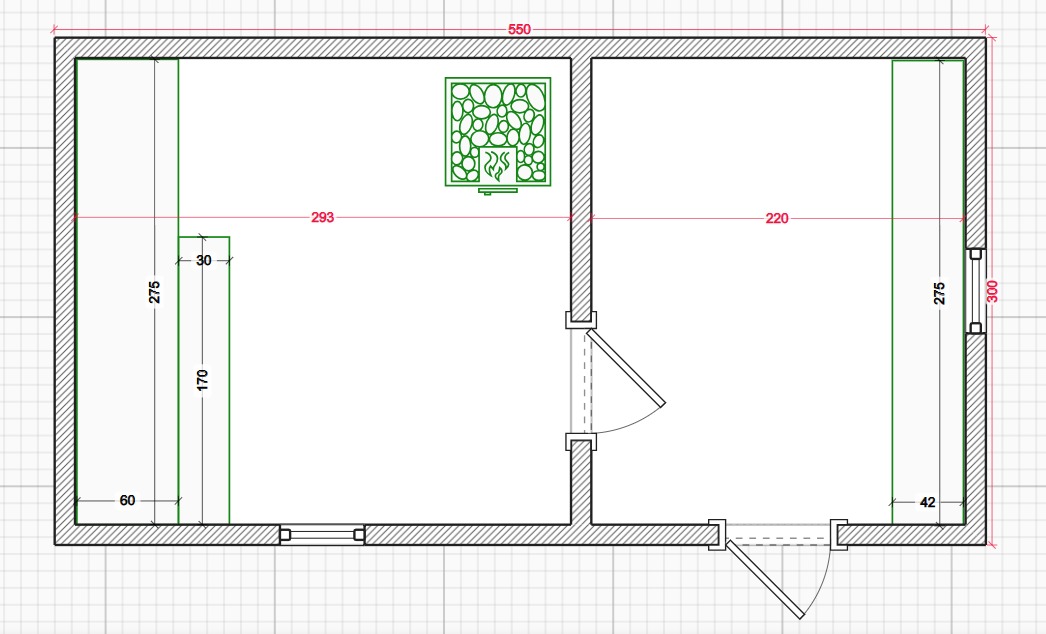 Размер парной 2.56х2.75м. размер предбанника 2.56х2.75 м.