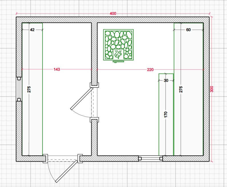 Размер бани 1.75х2.43 м. размер предбанника 1.75х1.17 м.