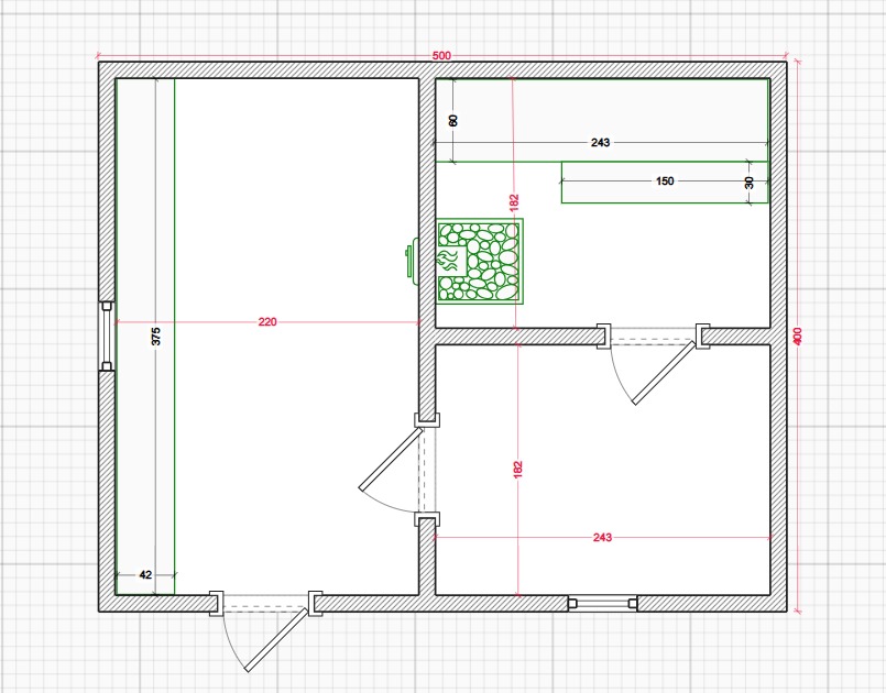 Размер бани 2.23х2.43 м. размер предбанника 2.23х1.67 м.